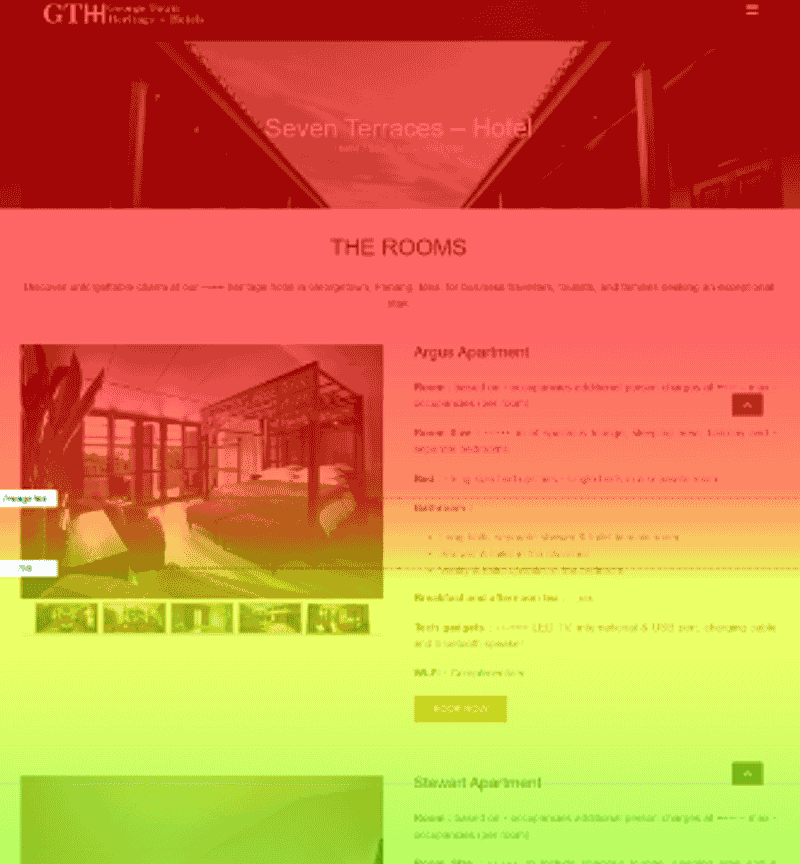 This heatmap analysis image reveals how users interact with the Georgetown Heritage Hotel’s room page by highlighting where they focus most. Warm colours (reds and oranges) show high attention areas like the hotel room image, type of room, and important amenities, while cooler tones indicate less engagement in lower sections.
