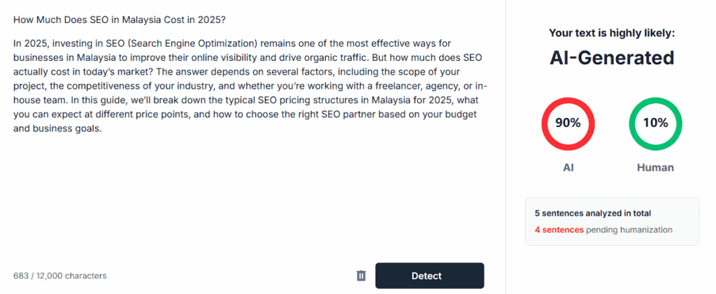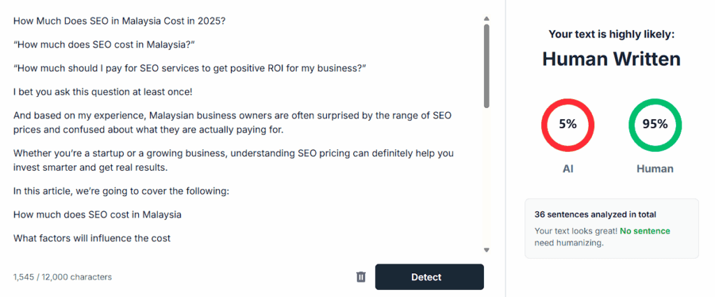 While AI-generated content can help speed up content creation, as shown in the first picture (with a 100% AI detection score), it often lacks the nuance, semantic depth, and user-intent tone as reflected in human-written content like in the second picture.