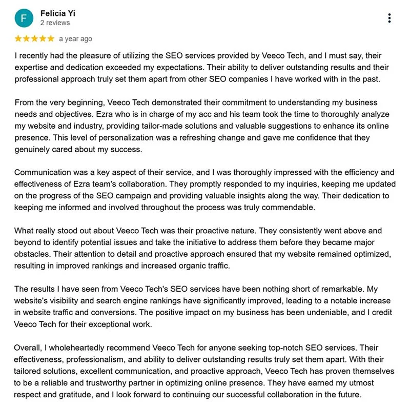 “The results I have seen from VeecoTech's SEO services have been nothing short of remarkable. My website's visibility and search engine rankings have significantly improved, leading to a notable increase in website traffic and conversions. The positive impact on my business has been undeniable, and I credit VeecoTech for their exceptional work.”